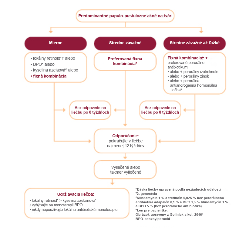 Obrázok č. 1: Liečebný algoritmus predominantného papulo-pustulózneho akné na tvári vrátane fixnej kombinovanej liečby