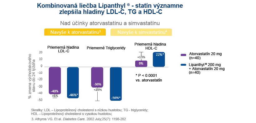 Otvorená, prospektívna, randomizovaná, paralelná štúdia, ktorá zahŕňa 120 pacientov s diabetes mellitus 2. typu a s kombinovanou hyperlipidémiou, (bez ochorenia koronárnych artérií na začiatku a pomerne primeranej kontroly glykémie), hodnotila účinok na lipidový profil týchto pacientov, kombinácie atorvastatín-fenofibrát v porovnaní s každým samotným liekom. Štúdia dospela k záveru, že pri zlepšovaní lipidového profilu, bola kombinovaná liečba atorvastatín-fenofibrát, v porovnaní s každým liekom samostatne, účinnejšia.3