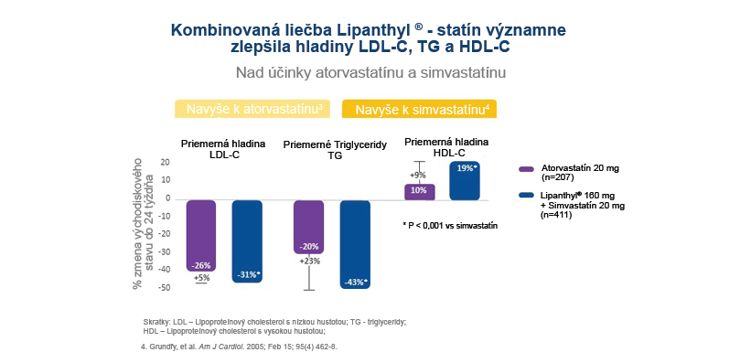 Multicentrická, randomizovaná, dvojito zaslepená, aktívne kontrolovaná štúdia na 600 pacientoch, s diagnostikovanou kombinovanou hyperlipidémiou, (hladina triglyceridov (TG) nalačno ≥3,9 mmol/l ≤ 12,9 mmol/l a s LDL cholesterolom >3,36 mmol/l), porovnávala účinnosť simvastatínu, monoterapia s kombinovanou liečbou, ktorá zahŕňala simvastatín plus fenofibrát. Kombinovaná liečba simvastatínom a fenofibrátom, v porovnaní s monoterapiou simvastatínom, významne zlepšila lipidový profil.4