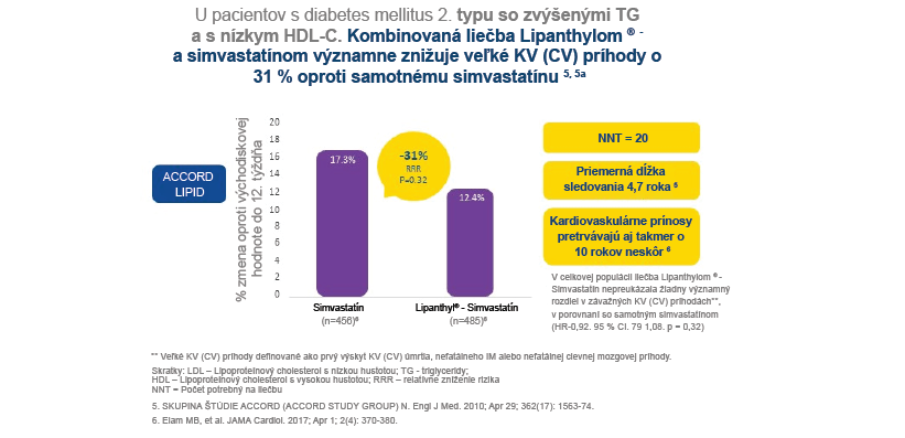 Lipidové skúšanie The Action to Control Cardiovascular Risk in Diabetes -ACCORD, (The Action to Control Cardiovascular Risk in Diabetes – ACCORD), sa uskutočnila u 5 518 pacientov s diabetes mellitus 2. typu s cieľom vyhodnotiť účinok liečby fenofibrátom ako doplnok k simvastatínu na zníženie rizika KVO (CVD) v porovnaní s monoterapiou statínom. Kombinovaná liečba signifikantne znížila hlavné KV (CV) príhody o 31 % (p=0,32), v porovnaní s monoterapiou simvastatínom u pacientov s dyslipidémiou, hoci celková populácia v štúdii nezaznamenala žiadny významný rozdiel v terapiách z hľadiska zníženia rizika KVO (CVD).5,5a Sledovanie tejto štúdie po takmer 10 rokoch zistilo, že kombinovaná liečba fenofibrát-simvastatín účinne znížila KVO (CVD) u pacientov s dyslipidémiou, napriek celkovo neutrálnym výsledkom pri obidvoch liečebných skupinách.6