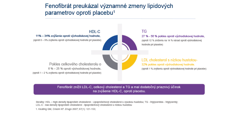 Klinická účinnosť fenofibrátov bola hodnotená v niekoľkých placebom kontrolovaných štúdiách u pacientov (priemerný vek 45 – 60 rokov) s primárnou hypercholesterolémiou a/alebo so zmiešanou dyslipidémiou. Fenofibrát preukázal významné zmeny v lipidových parametroch u pacientov s primárnou hypercholesterolémiou a/alebo zmiešanou dyslipidémiou v porovnaní s placebom 1 .
