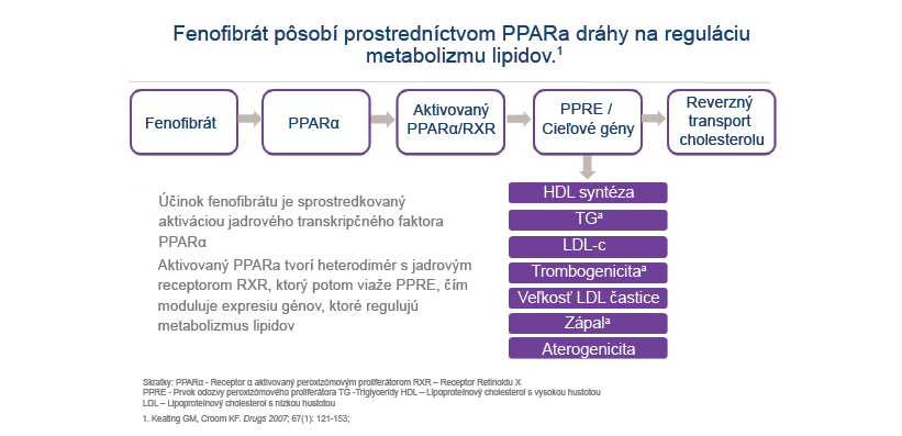 Účinky fenofibrátu na úpravu lipidov sú indukované aktiváciou jeho jadrového transkripčného faktora, receptora-α, ktorý je aktivovaný peroxizómovým proliferátorom (PPARα). Heterodimér sa vytvára medzi aktivovaným PPARα a ďalším jadrovým receptorom, retinoidným X receptorom (RXR). Ďalej sa na tento heterodimér viažu špecifické prvky odpovede peroxizómového proliferátora (PPRE), a preto je modulovaná génová expresia, ktorá reguluje metabolizmus lipidov. V dôsledku toho sa zvyšuje lipolýza a plazmatický klírens lipoproteínov, ktoré sú bohaté na aterogénne triglyceridy (TG), zatiaľ čo dostupnosť mastných kyselín pre syntézu TG je nízka, čo pri pacientovi znižuje hladiny TG. Syntéza ApoAI a ApoAII, (hlavné HDL proteíny), sa tiež zvyšuje, čo vedie k zvýšeniu HDL. Zvyšuje sa aj spätný transport cholesterolu. Fenofibrát tak zvyšuje klírens LDL, čím sa znižuje podiel aterogénneho LDL. Hladiny prozápalových cytokínov sú znížené. Dochádza tiež k posunu k väčším, nadnášajúcim časticiam LDL, čím sa zvyšuje klírens LDL a znižuje sa podiel aterogénneho LDL. Dráha PPARα reguluje metabolizmus lipidov, čím znižuje aterogenitu a trombogenicitu 1.