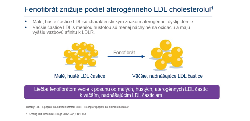 Fenofibrát účinkuje tak, že znižuje podiel malých, hustých LDL častíc a premieňa ich na väčšie, nadnášajúce LDL častice. Väčšie LDL častice sú menej husté, a preto sú menej náchylné na oxidáciu. Namiesto toho majú vysokú väzbovú afinitu k LDL receptorom, ktoré následne transportujú tieto väčšie LDL častice cez bunkovú membránu. Fenofibrát tak zvyšuje klírens LDL, čím sa znižuje podiel aterogénneho LDL.1