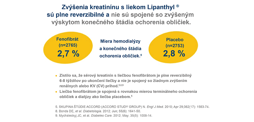 Štúdia ACCORD Lipid u pacientov s diabetes mellitus 2. typu hodnotila nežiaduce účinky, (okrem iného výskyt hemodialýzy a konečného štádia renálneho ochorenia), fibrátov pri použití v kombinácii so statínmi. Nepozoroval sa žiadny významný rozdiel vo výskyte obidvoch, hemodialýzy a terminálneho štádia renálneho ochorenia medzi týmito dvoma skupinami, čo naznačuje, že kombinovaná liečba fenofibrátom a simvastatínom3 je spojená s rovnakou mierou terminálneho štádia renálneho ochorenia a dialýzy ako monoterapia simvastatínom. Zistilo sa, že hladiny kreatinínu v sére sa pri kombinovanej liečbe fenofibrátom a simvastatínom zvyšujú, ale 6–8 týždňov po ukončení liečby sa úplne zmenia na východiskové hodnoty. U pacientov, ktorí boli liečení kombinovanou liečbou fenofibrátom a simvastatínom neboli zaznamenané žiadne dlhodobé nežiaduce účinky, v zmysle akéhokoľvek zvýšenia renálnych alebo kardiovaskulárnych príhod. 3,4,5