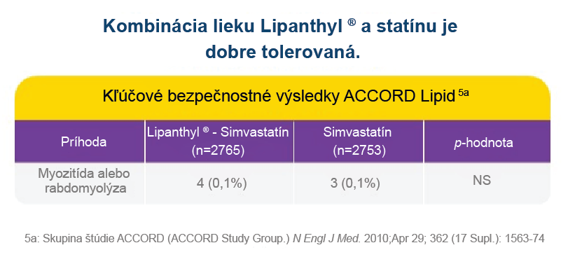 Štúdia ACCORD Lipid, ktorá zahŕňala 5 518 pacientov s diabetes mellitus 2. typu, hodnotila riziko závažných nežiaducich účinkov, (okrem iného myozitídy alebo rabdomyolýzy), ktoré sa môžu vyskytnúť pri kombinácii liečiv, alebo samostatne. Štúdia dospela k záveru, že kombinovaná liečba fenofibrátom a simvastatínom nezvyšuje riziko myozitídy alebo rabdomyolýzy, v porovnaní s monoterapiou simvastatínom.1