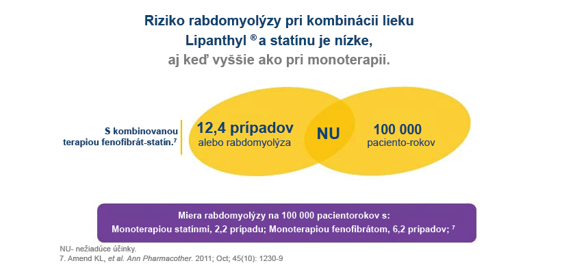 Retrospektívna farmakoepidemiologická štúdia, ktorá zahŕňala 1 116 805 pacientov, odhadla a porovnala mieru výskytu hospitalizovanej rabdomyolýzy, počas období expozície statínom statínom samotným a v kombinácii s fibrátmi. Miera výskytu rabdomyolýzy v skupine s kombinovanou liečbou fenofibrát-statín bola približne 12,4 % (95 % IS 4,97 až 25,48) na 100 000 pacientorokov. Miera rabdomyolýzy (na 100 000 pacientorokov), pri monoterapii statínmi bola 2,46 (95 % IS 1,64 až 3,56) a pri monoterapii fenofibrátom 6,2 (95 % IS 2,01 až 14,47). Celkove sa zistilo, že kombinácia fenofibrát-statín je spojená s výrazne vyššou mierou rabdomyolýzy v porovnaní s monoterapiou statínom alebo monoterapiou fenofibrátom (12,37 vs. 2,46 vs. 6,20, v uvedenom poradí; 95% IS).2
