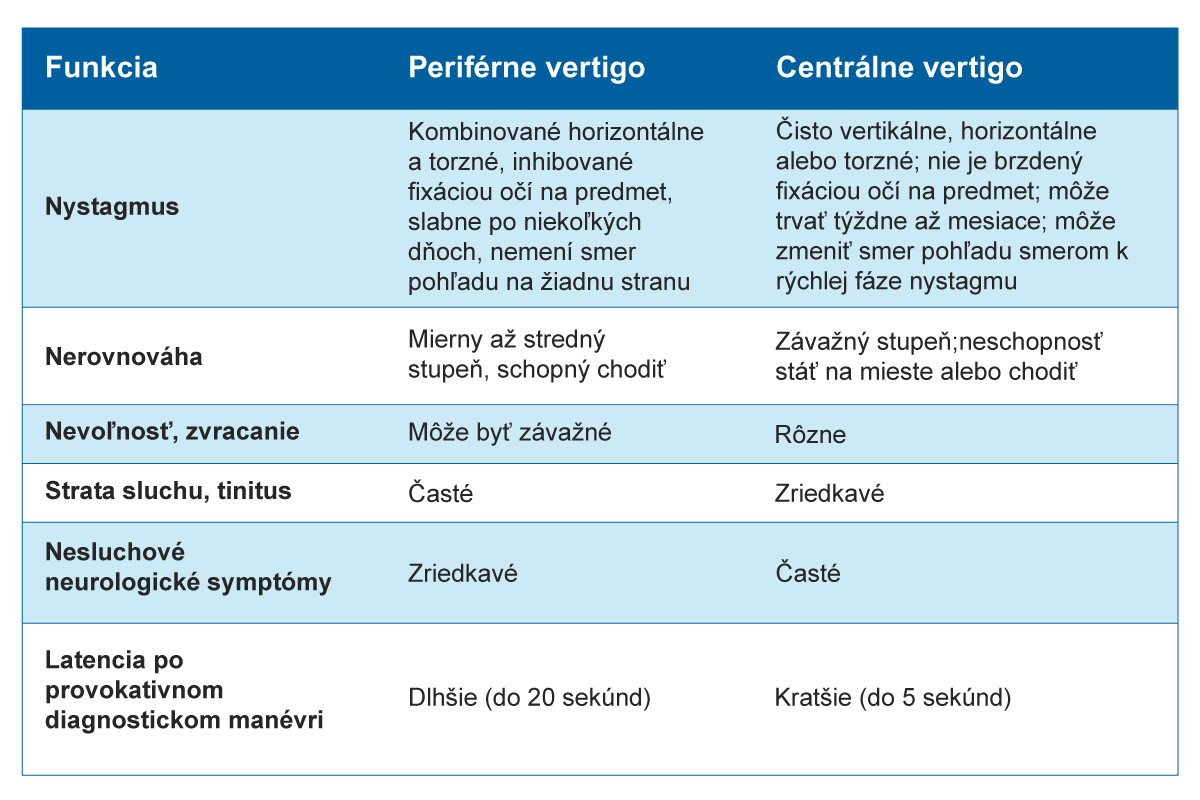 Charakteristické znaky periférnych a centrálnych príčin vestibulárneho vertiga6