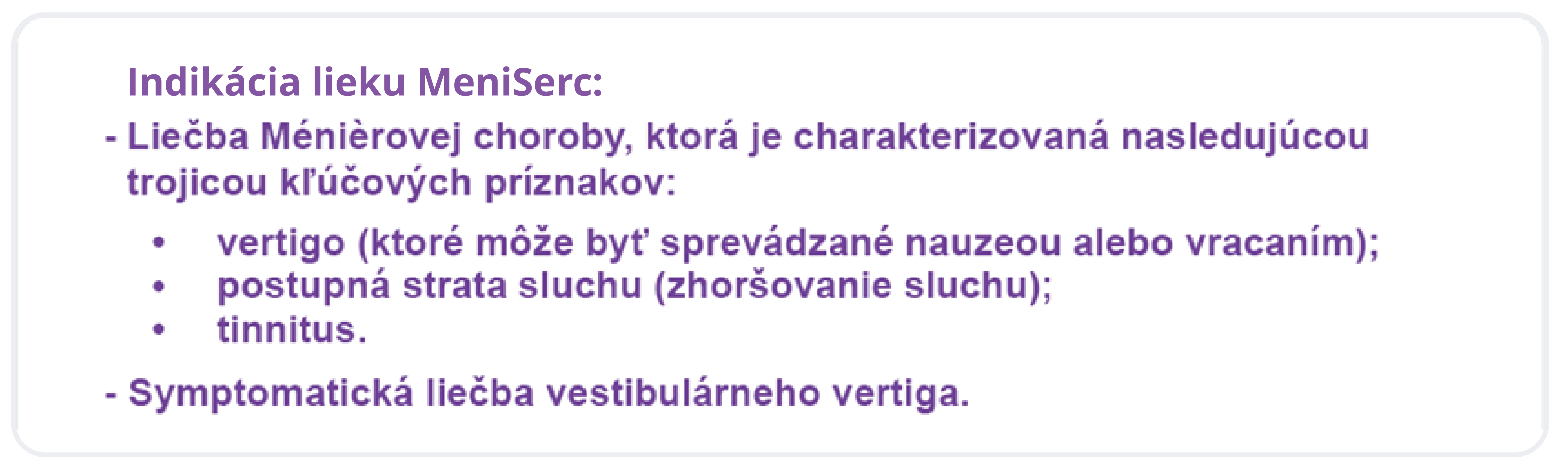 Výdaj lieku MeniSerc je viazaný na lekársky predpis. Pred predpísaním lieku sa oboznámte s úplným znením súhrnu charakteristických vlastností lieku: https://www.viatris.sk/sk-sk/produkty/preh%C4%BEad-produktov