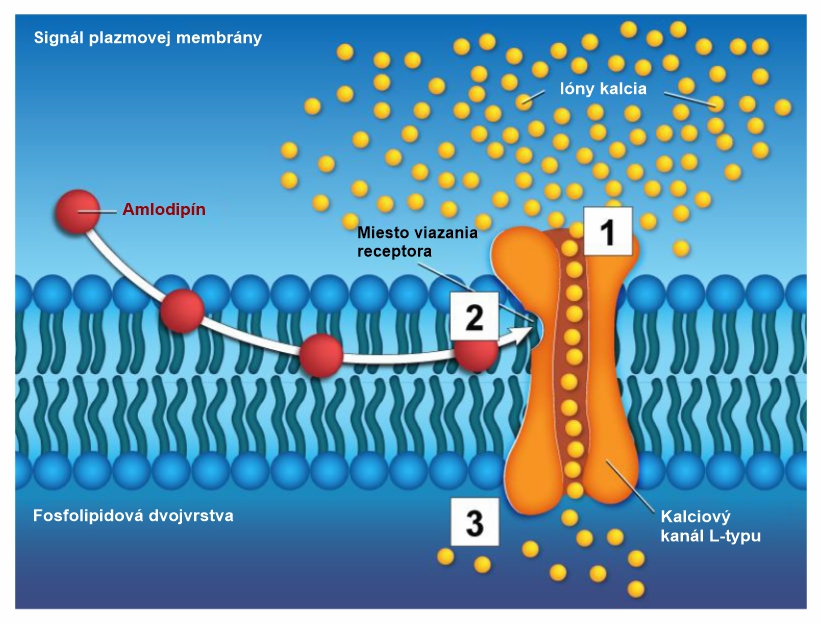 CCB (blokátory kalciových kanálov) boli pôvodne vyvinuté ako silné vazodilatátory kvôli ich schopnosti viazať sa na kalciový kanál typu L a blokovať ho. Tým sa znížil prítok kalcia do buniek hladkého svalstva (SMC-smooth muscle cells), čo viedlo k relaxácii hladkého svalstva a vazodilatácii. Amlodipín nielenže ľahko preniká cez plazmatickú membránu, aby interagoval s kalciovým kanálom typu L, ale má aj ďalšie biologické alebo pleiotropné účinky, ktoré sú nezávislé od interakcie s kalciovým kanálom. Okrem toho majú tieto CCB účinky na iné typy buniek ako bunky hladkého svalstva ciev (VSMC-vascular smooth muscle cells), bunky, v ktorých kalciové kanály typu L neexistujú alebo hrajú len malú úlohu.2
