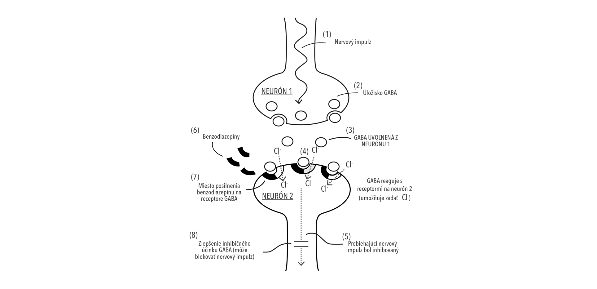 Schéma mechanizmu účinku prirodzeného neurotransmitera GABA (kyseliny gama-aminomaslovej) a benzodiazepínov na nervové bunky (neuróny) v mozgu