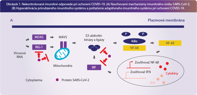 FAS: receptor bunkovej smrti; IFN: interferón; IRF: faktory regulujúce IFN; IκBα: jadrový faktor zosilňovača génu kappa ľahkého polypeptidu v B bunkách inhibítor, alfa; MAVS: mitochondriálny antivírusový signálny proteín; MDA5: gén 5 súvisiaci s diferenciáciou melanómu; NF-kB: jadrový kB faktor; PD-1: proteín 1 programovanej bunkovej smrti; RIG-I: gén I indukovateľný kyselinou retinovou; RNA: Kyselina ribonukleová.