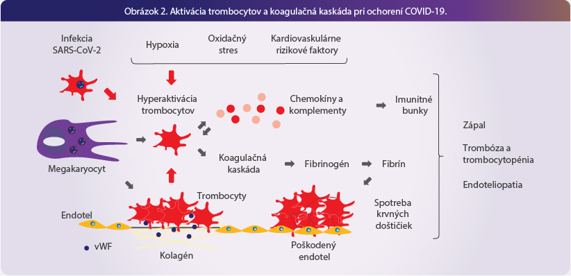 - Infekcia SARS-CoV-2 priamo a nepriamo spôsobuje nekontrolované imunitné reakcie, hyperaktiváciu krvných doštičiek a endoteliálnu dysfunkciu, ktoré sa navzájom ovplyvňujú a dochádza k ich zhoršeniu vplyvom kardiovaskulárnych rizikových faktorov.