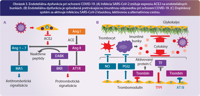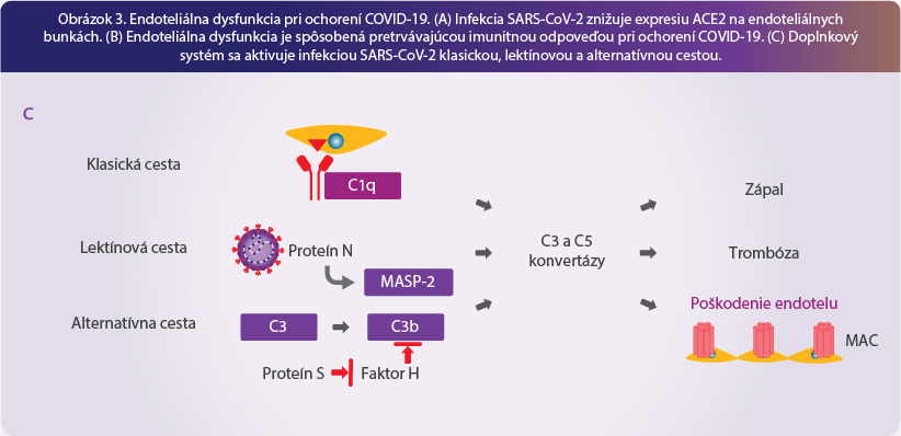 ACE: enzým konvertujúci angiotenzín; Ang: angiotenzín; AT III: antitrombín III; AT1R: receptory angiotenzínu typu 1; BKR: Bradykinínové receptory; DABK: Des-Arg(9)-bradykinín; C1q: zložka komplementu C1q; C3: konvertáza C3; C3b: väčšia zložka vytvorená štiepením zložky komplementu 3; C5: konvertázy C5; MAC: membránový útočný komplex; MASP-2: serínová proteáza spojená s lektínom viažucim manózu 2; H proteín: multifunkčný proteín, ktorý zobrazuje funkcie mimo doplnkového systému; N proteín: Nukleokapsidový proteín; NO: oxid dusnatý; PGI2: prostacyklín; TF: tkanivový faktor; TFPI: Inhibítor dráhy tkanivového faktora, S proteín: Spike proteín.