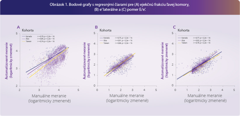 Koeficienty r a hodnoty p sú určené pre logaritmicky transformované hodnoty.V ázijskej kohorte: Korelácia medzi automatizovanými a manuálnymi meraniami sa pohybovala od r = 0,88 pre E vlnu (priemerná absolútna chyba [MAE] 7,4 cm/s) do r = 0,95 pre systolický objem konca ľavej komory (LVESV) (MAE 10,2 ml). Korelácia medzi automatizovanými a manuálnymi meraniami bola r = 0,89 (MAE 5,5 %) pre LVEF, r = 0,92 (MAE 0,7 cm/s) pre e' laterálne a r = 0,90 (MAE 1,7) pre pomer E/e'.V kanadskej kohorte: Korelácie medzi automatizovanými a manuálnymi meraniami sa pohybovali od r = 0,67 pre e' mediálne (MAE 1,0 cm/s) do r = 0,91 pre LVESV (MAE 16,5 ml). Korelácia medzi automatizovanými a manuálnymi meraniami bola r = 0,75 (MAE 8,6 %) pre ejekčnú frakciu ľavej komory (LVEF), r = 0,78 (MAE 1,2 cm/s) pre e’ laterálne a r = 0,75 (MAE 2,2) pre pomer E/e’. V Taiwanskej kohorte: Korelácia medzi automatizovanými a manuálnymi meraniami sa pohybovala od r = 0,62 pre systolický objem na konci ľavej predsiene (LAESV) (MAE 9,2 ml) do r = 0,88 pre e’ laterálne (MAE 1,6 cm/s). Korelácia medzi automatizovanými a manuálnymi meraniami bola r = 0,75 (MAE 10,2 %) pre LVEF, r = 0,87 (MAE 1,6 cm/s) pre e’ laterálne a r = 0,79 (MAE 1,8) pre pomer E/e’.